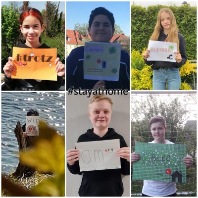 In der ersten Woche trug unsere Klasse dazu bei, positive Nachrichten unter dem Titel #stayathome zu verbreiten. Dafür erstellten wir in unseren Tischgruppen, für die wir eigene Videokonferenzräume für Gruppenarbeiten usw. haben, Fotos von uns mit selbstgezeichneten Bildern, auf denen wir Wörter präsentierten, die zusammengestellt einen individuellen Satz ergaben. In der darauffolgenden Woche führten wir gemeinsam ein virtuelles Krimidinner durch. Ziel des Spiels war es, den Täter zu überführen. Dies konnte nur gelingen, indem untereinander der Tatablauf diskutiert und Erinnerungen an das Geschehen zusammentragen wurden. Mit Eifer und Durchhaltevermögen spielten sich die Tischgruppen durch alle Runden und konnten den Täter meist erwischen. In der nächsten Woche sollen wir uns dann selbst herausfordern, indem wir jeden Tag eine gute Tat vollbringen und Gedichte mit Fotos zu unserem Lieblingsplatz verfassen. Denn im Deutschunterricht geht es gerade um Gedichte.